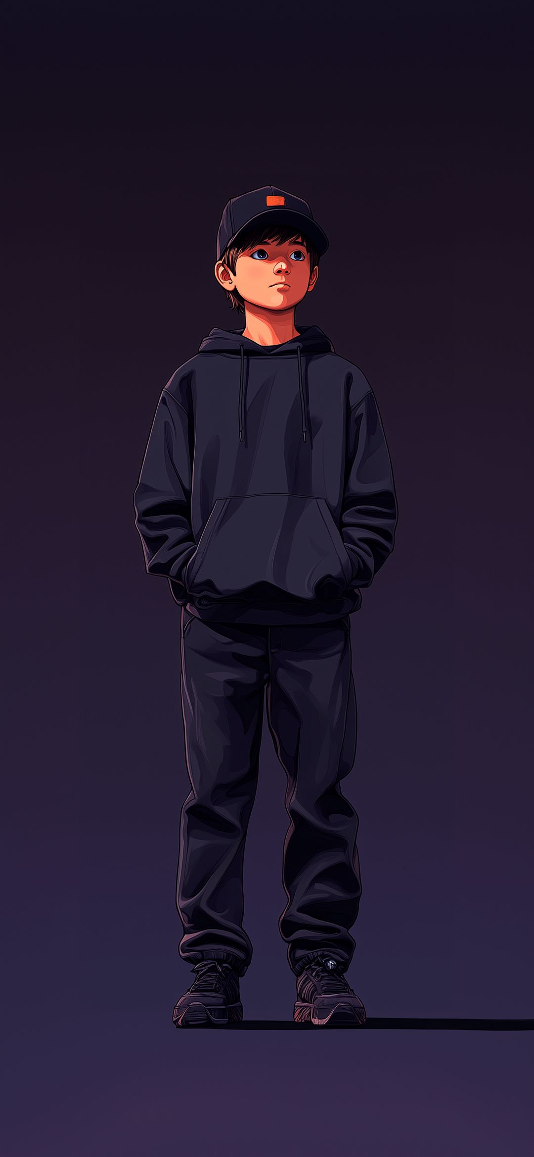 A cool illustration of a young boy wearing a dark hoodie and baseball cap. The artwork has a stylish, urban vibe, perfect for a modern wallpaper.