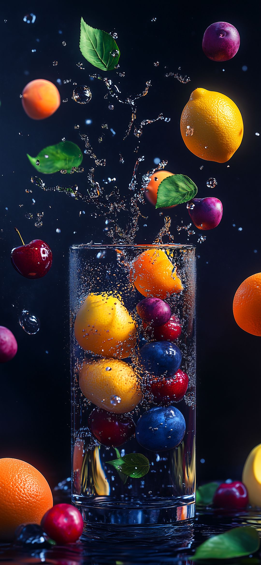 A vibrant splash of fresh fruits like lemons, oranges, cherries, and blueberries cascades into a glass, creating a refreshing and dynamic visual. Perfect for adding a burst of flavor to your screen.