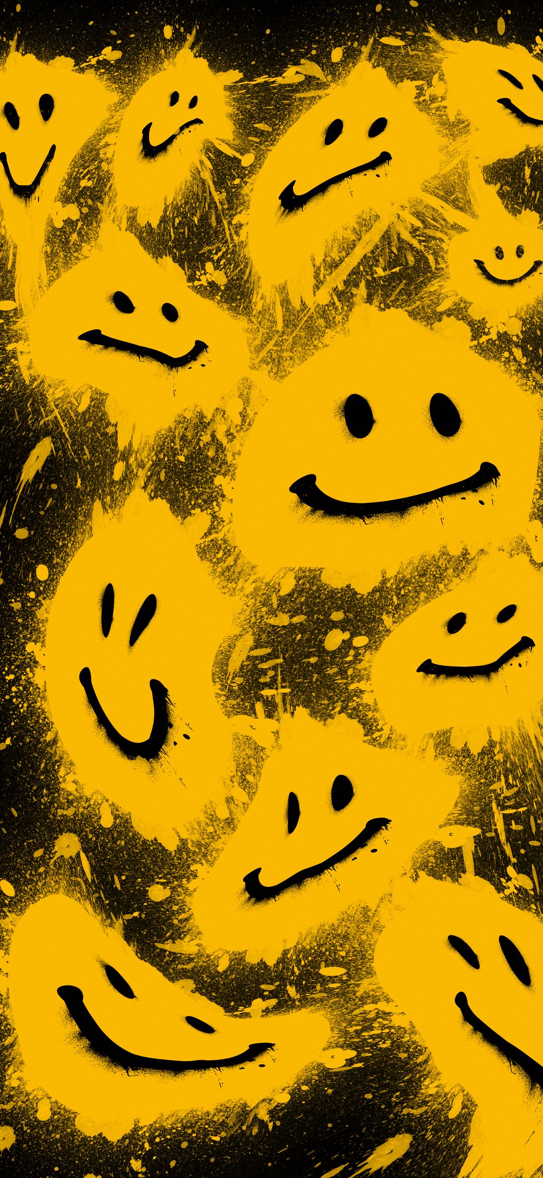 Vibrant yellow smiley faces spray-painted onto a black background. This urban art wallpaper captures a playful yet edgy mood with its graffiti-inspired style.