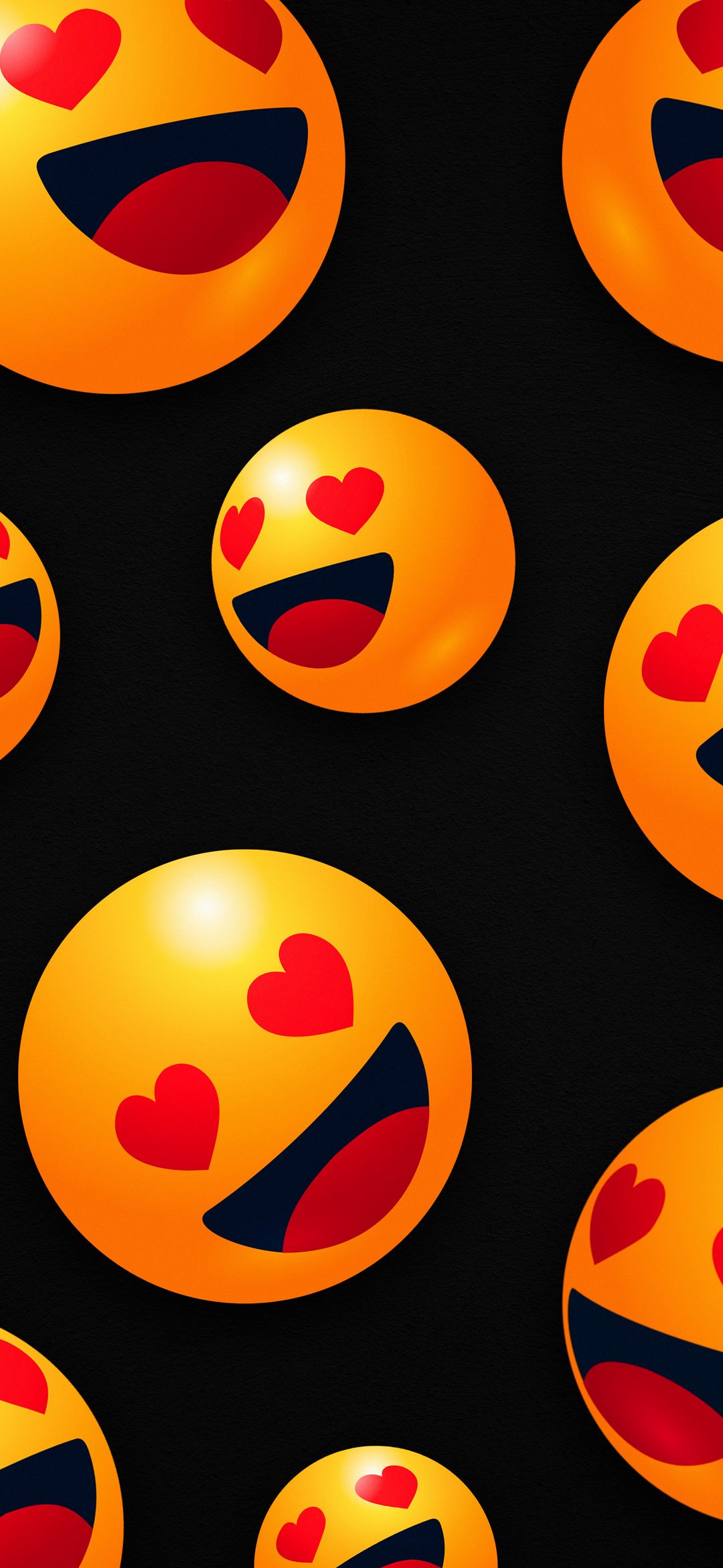 Bright yellow emojis with heart eyes and wide smiles pop against a dark background. This playful pattern radiates joy and affection, perfect for adding a touch of fun and love to your screen.