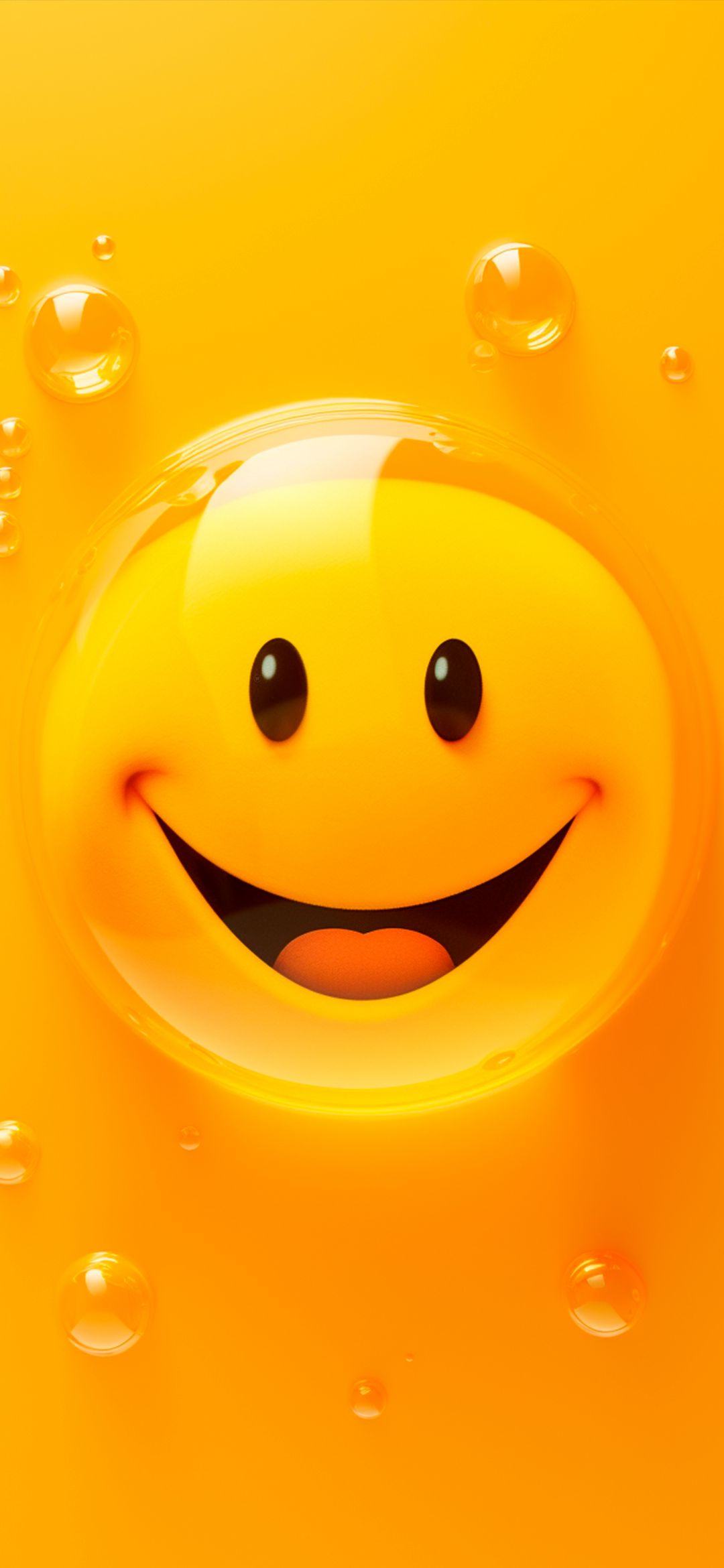 A cheerful, bright orange smiley face with a wide grin and two dark eyes, surrounded by glossy water droplets. This vibrant wallpaper brings a burst of happiness and a playful mood to any screen.