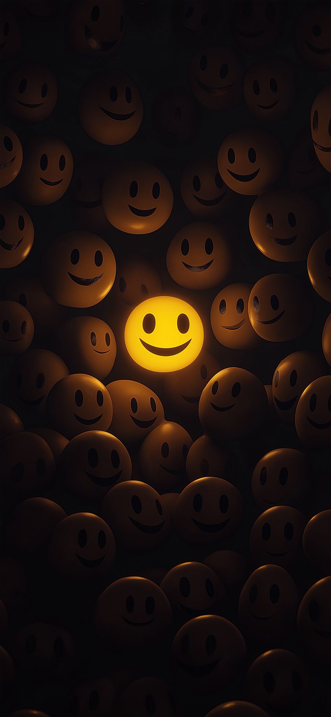 A single, brightly lit smiley face stands out amongst a crowd of darker, muted ones. This image evokes a feeling of positivity and individuality, perfect for adding a cheerful touch to any device. It's a reminder that even in darkness, brightness ...