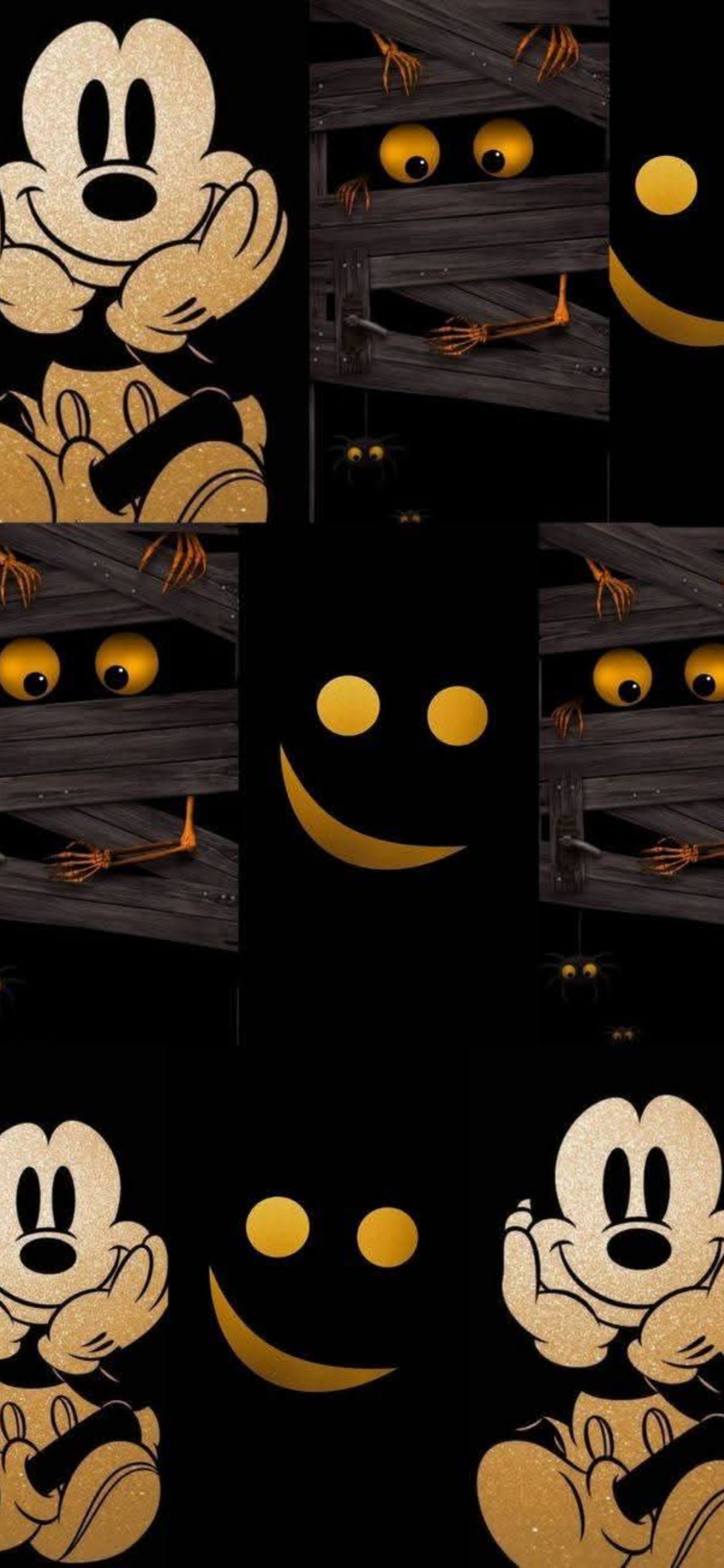 Get into the Halloween spirit with this spooky Mickey Mouse wallpaper! Featuring a golden Mickey and creepy elements like glowing eyes and skeleton hands peeking from wooden planks. Perfect for fans of Disney and Halloween.