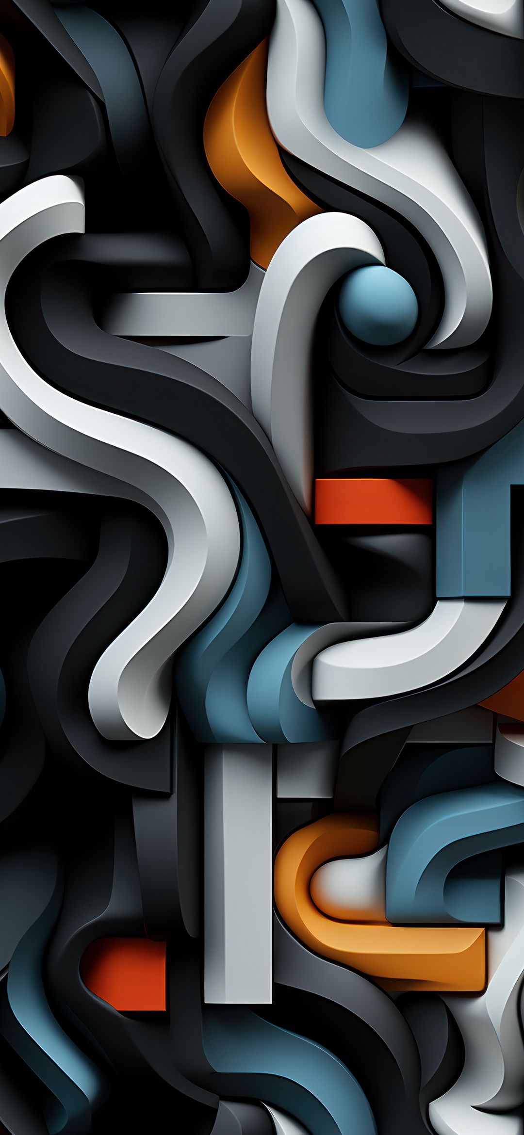Explore a captivating 3D abstract art piece with flowing lines and bold geometric shapes. This modern wallpaper features a dynamic interplay of dark tones, white, blue, and orange, creating a visually striking and sophisticated design.