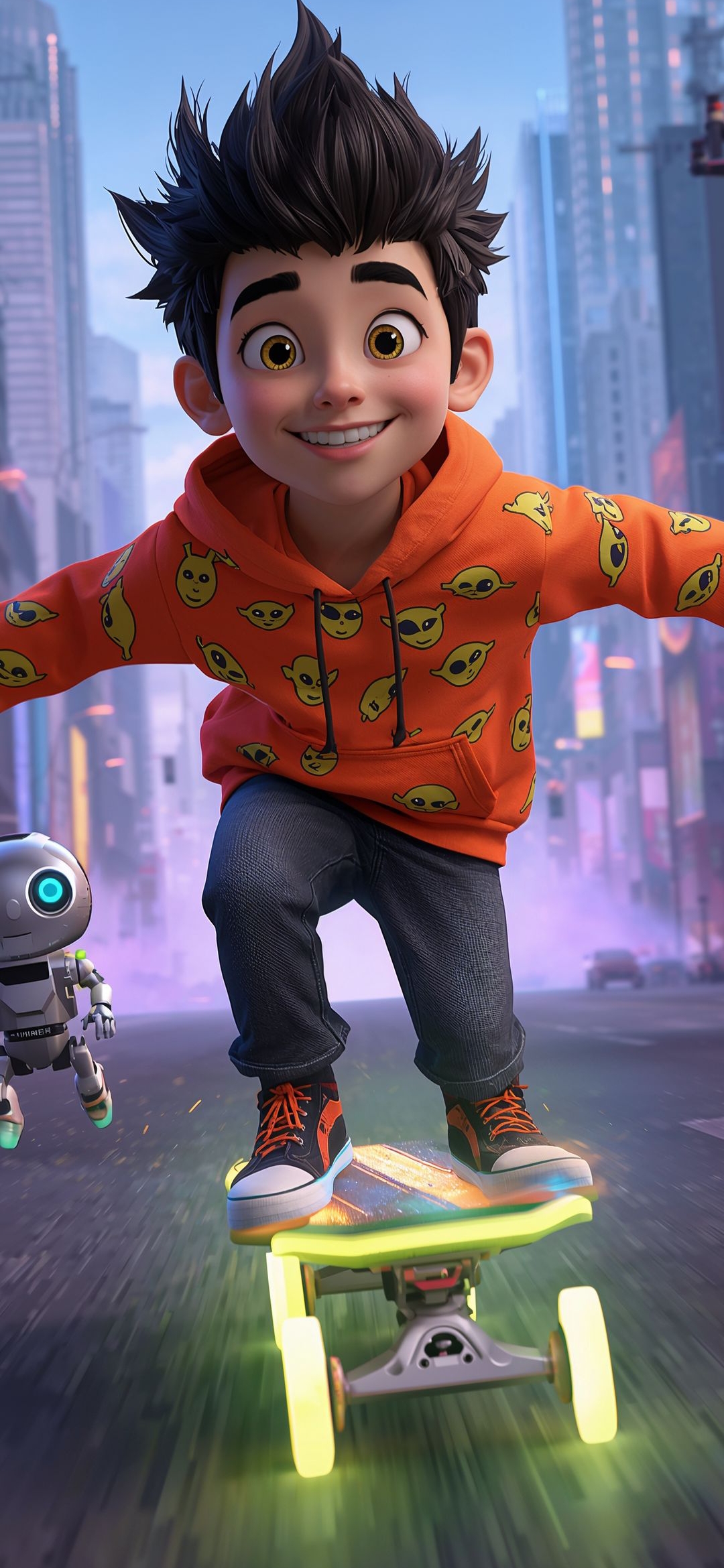 A cheerful animated boy rides a glowing skateboard through a vibrant city. A friendly robot companion zooms alongside him. This scene captures a fun, futuristic urban adventure.