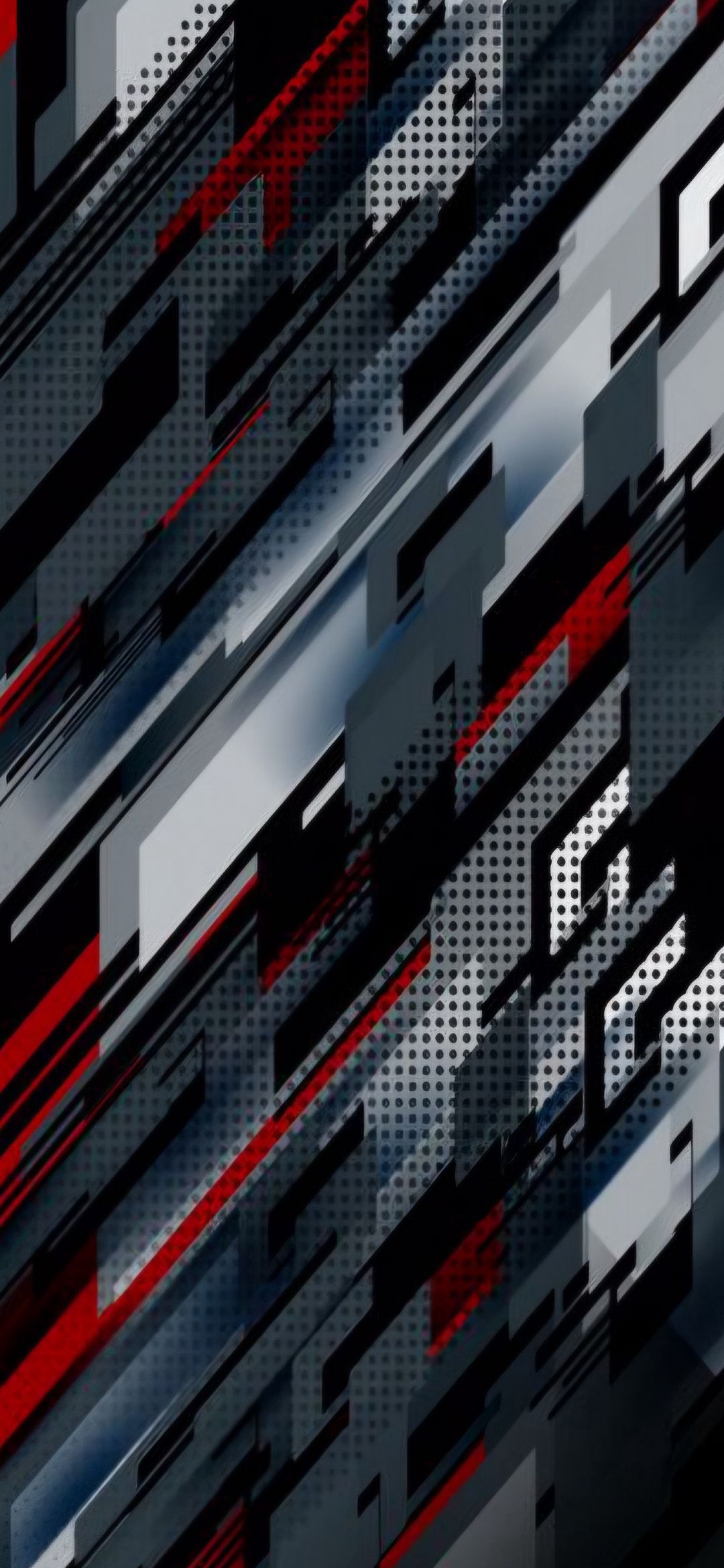 Abstract geometric design with sharp lines and bold red accents. This dynamic wallpaper features a dark, futuristic feel with a repeating dot pattern, perfect for a modern aesthetic.