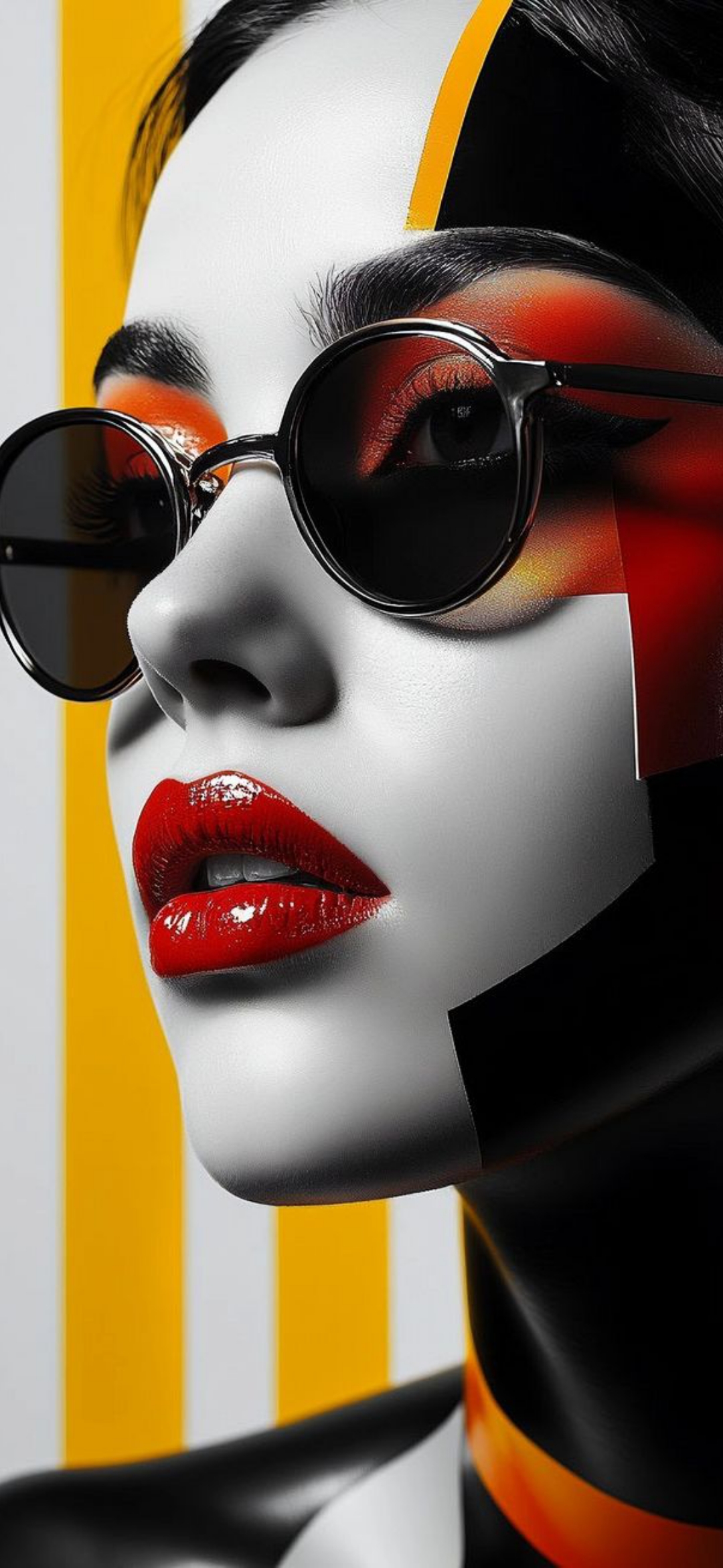 A striking portrait featuring bold makeup and sunglasses. The face is adorned with geometric shapes and vibrant colors, creating a modern and edgy aesthetic. This artwork blends fashion and art with a captivating visual style.