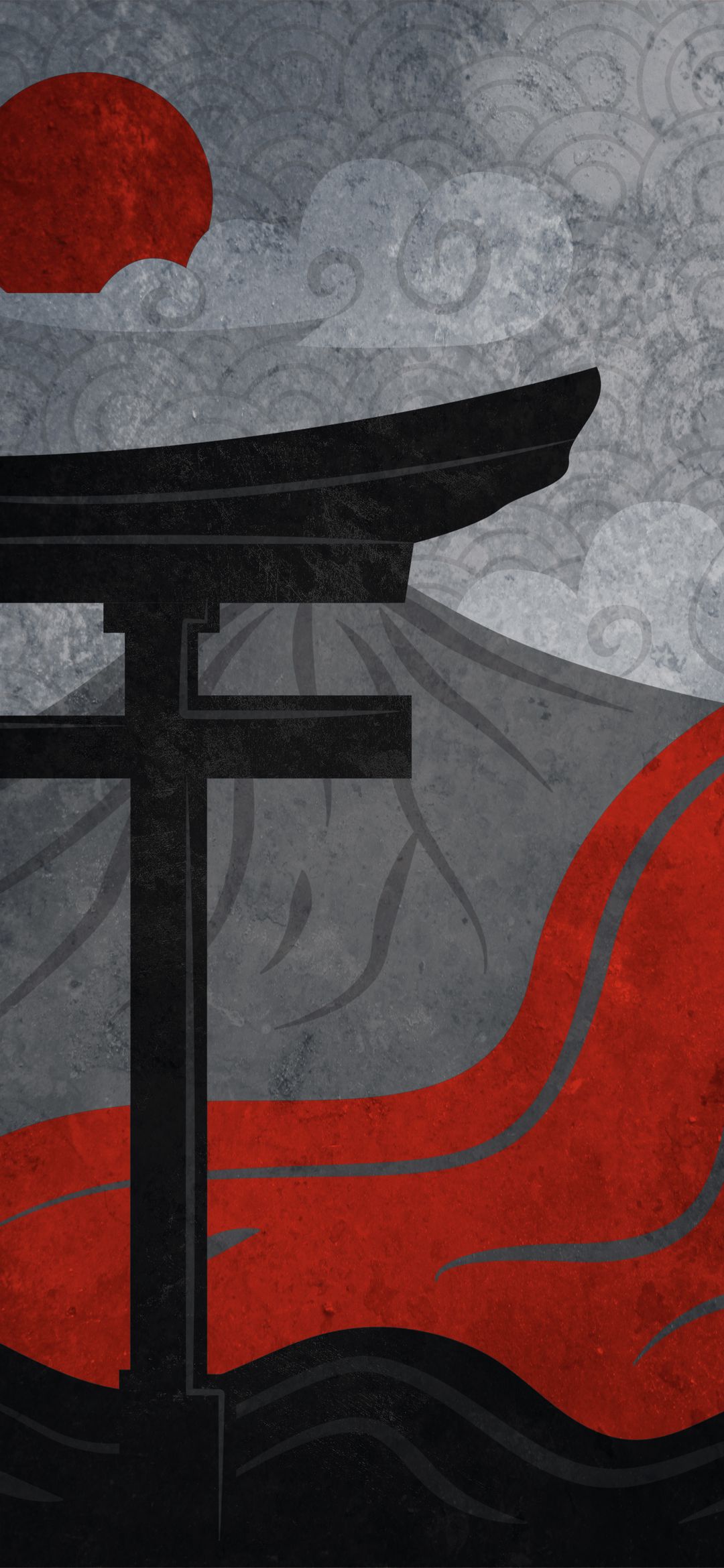 A striking minimalist wallpaper featuring a black torii gate silhouetted against a textured gray sky with a red sun. The iconic Mount Fuji is visible behind, with flowing red and black abstract elements suggesting a dramatic landscape. This art ev...