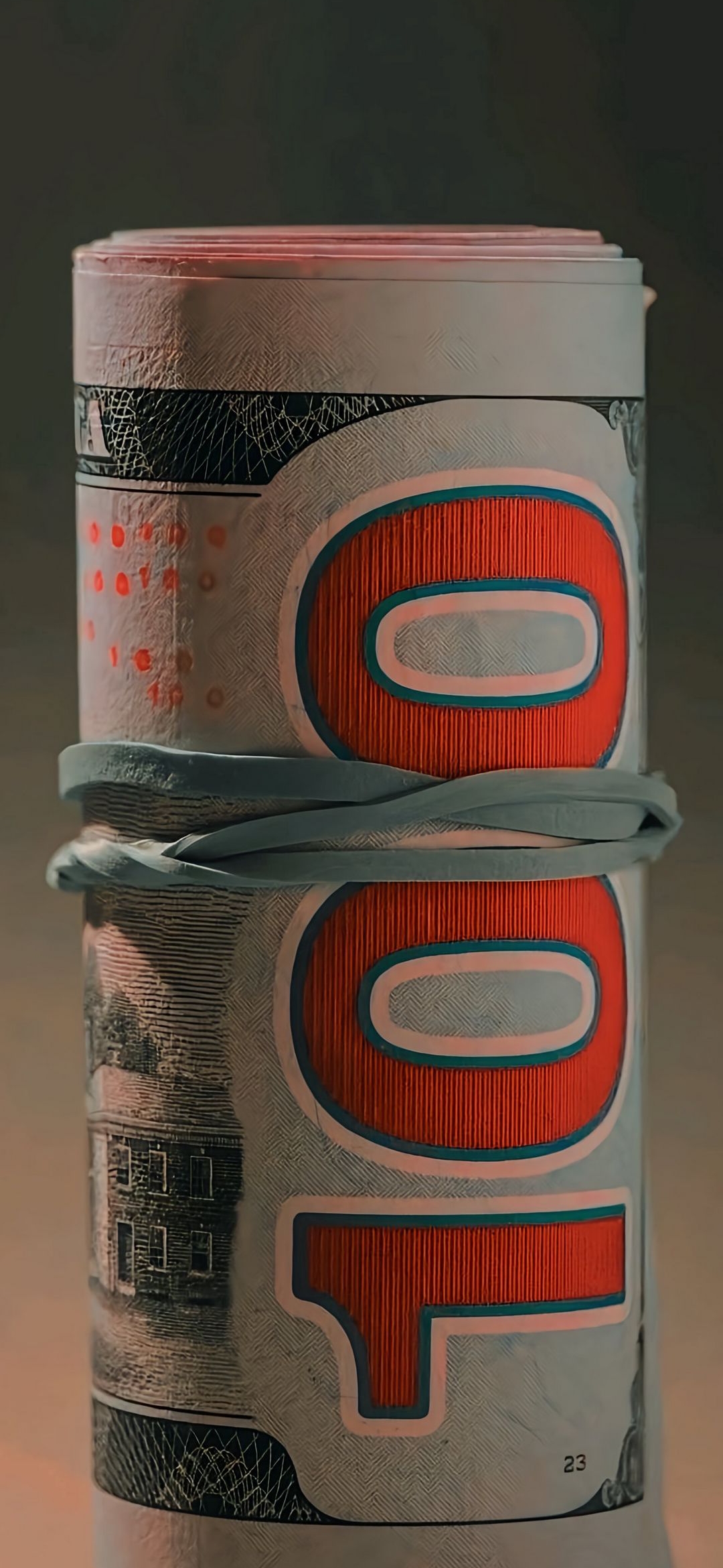A close-up view of a roll of hundred dollar bills, secured by a rubber band. The prominent '100' and intricate details of the currency create a visually striking image. This wallpaper evokes themes of wealth and finance.