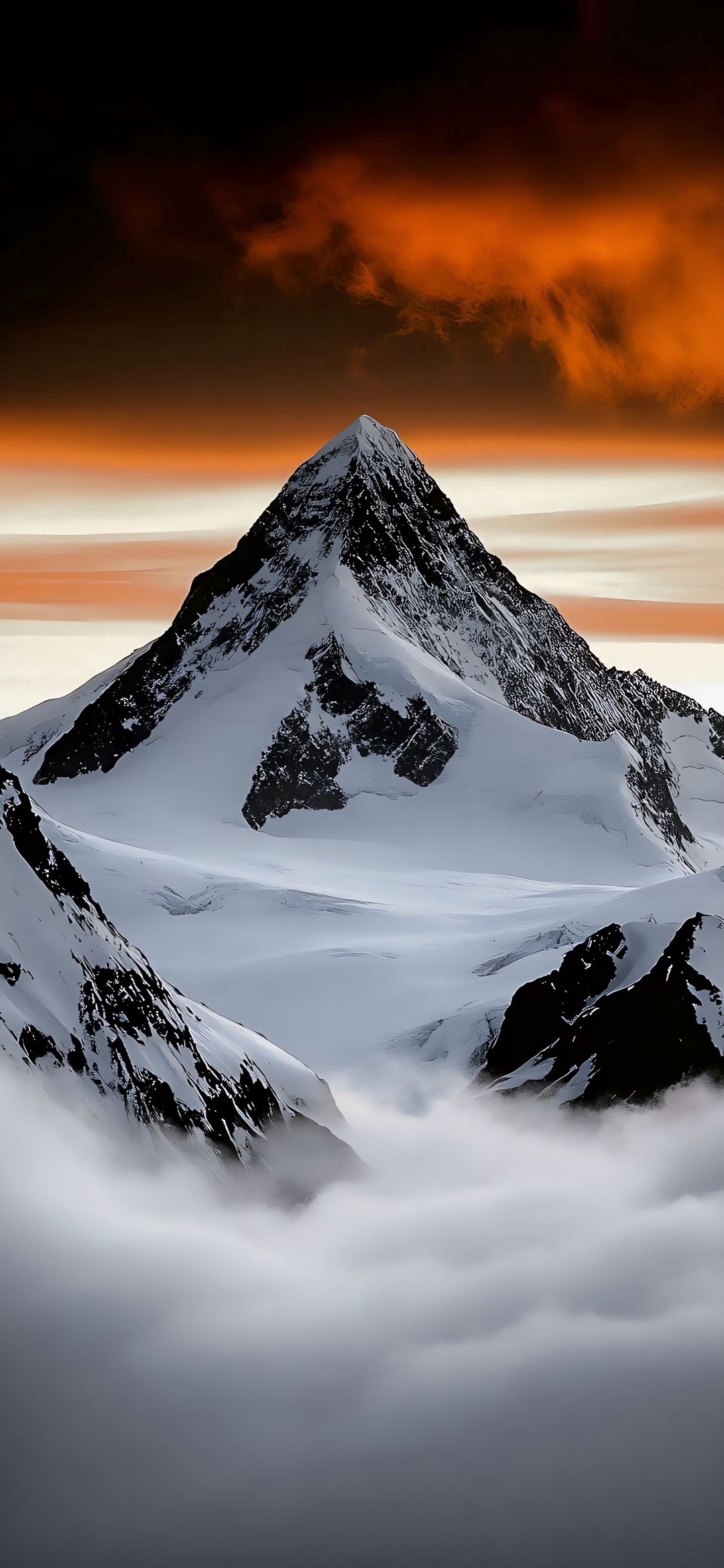 Majestic snow-capped mountains pierce a dramatic sky with fiery sunset clouds. A breathtaking landscape wallpaper capturing the raw beauty of nature and the serene power of the peaks above the clouds.