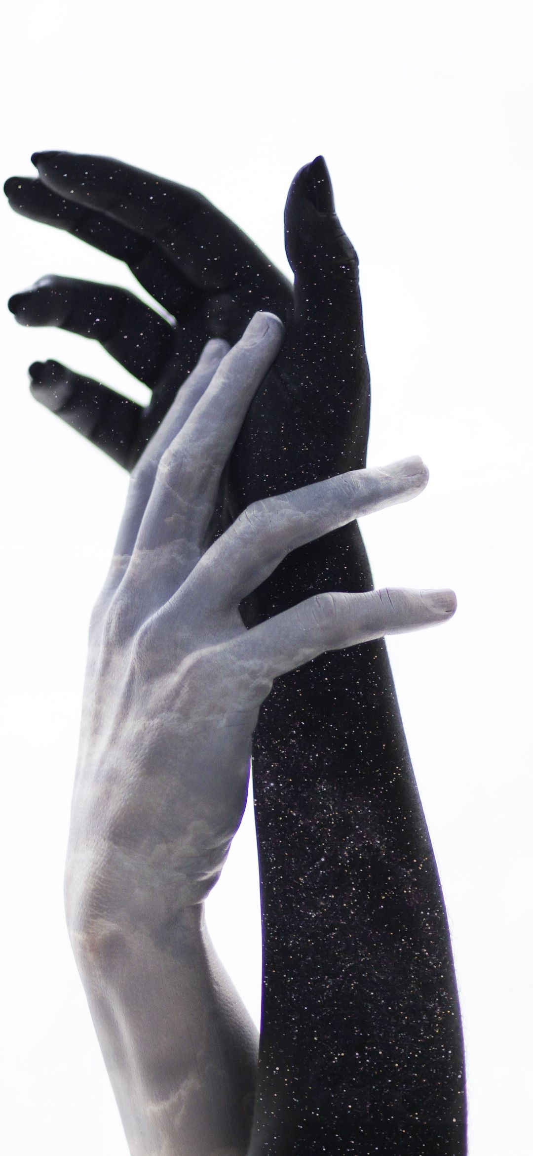 Two hands, one light and ethereal, the other dark and speckled like the night sky, reach out and touch. This striking image evokes a sense of mystery and connection.