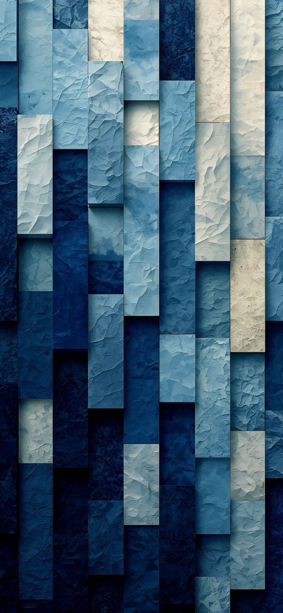 A cool wallpaper with a pattern of rectangular blocks. Each block has a unique cracked texture, in shades of deep blue, light blue, and off-white, creating a modern abstract design.
