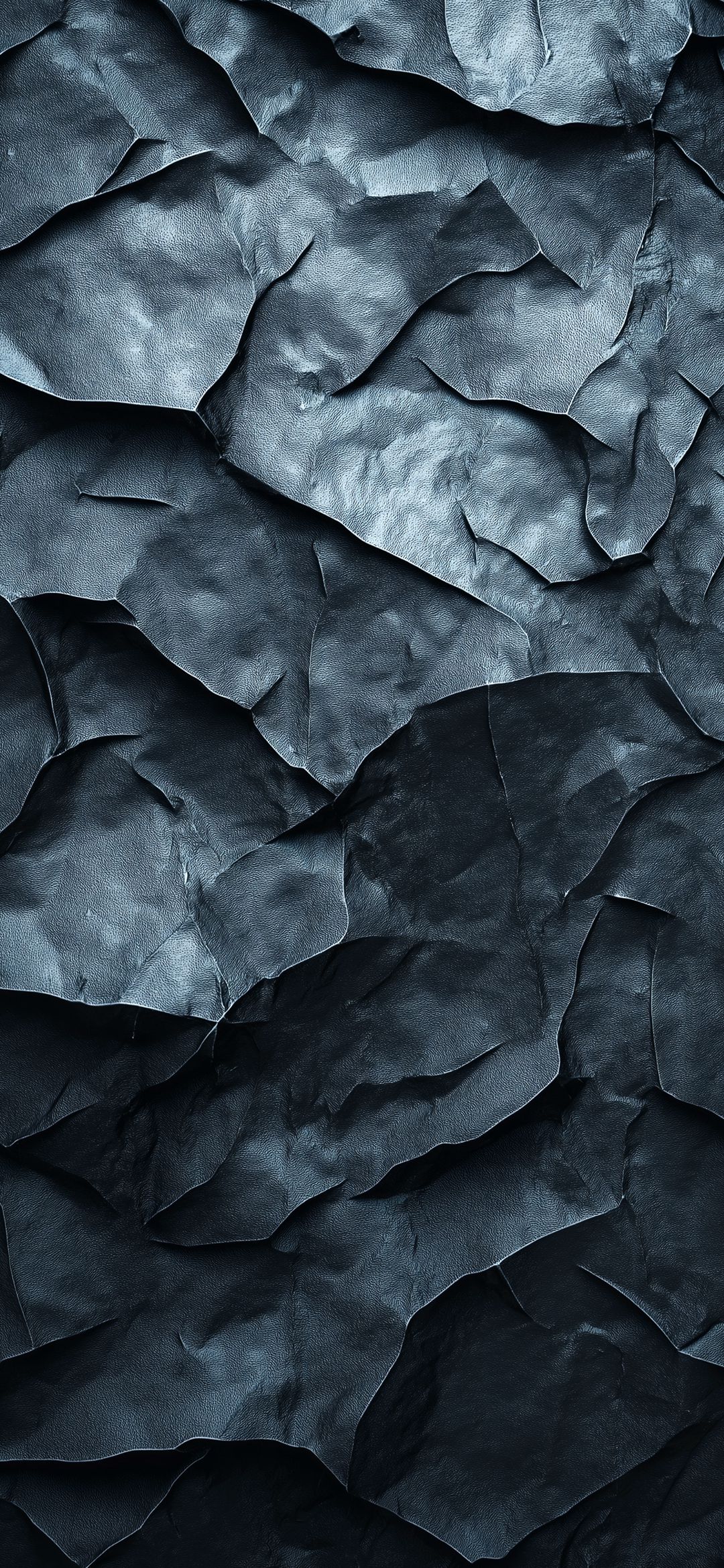Explore a dark, textured abstract wallpaper. Its deep, crinkled surfaces create a dramatic and mysterious mood, perfect for a sophisticated gallery backdrop.