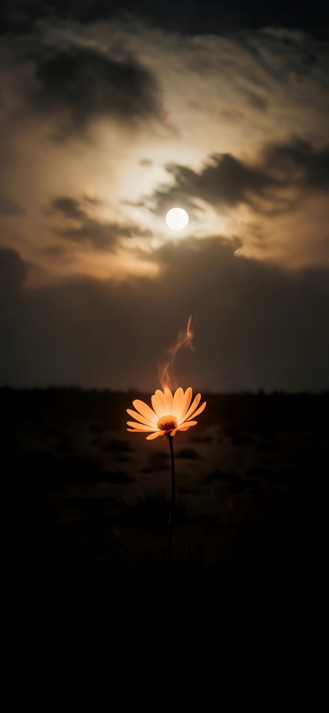A single, radiant flower glows with inner light against a dramatic sunset sky. Wisps of smoke curl upwards, creating a mystical and serene atmosphere. This image captures the beauty of nature with a touch of magic.