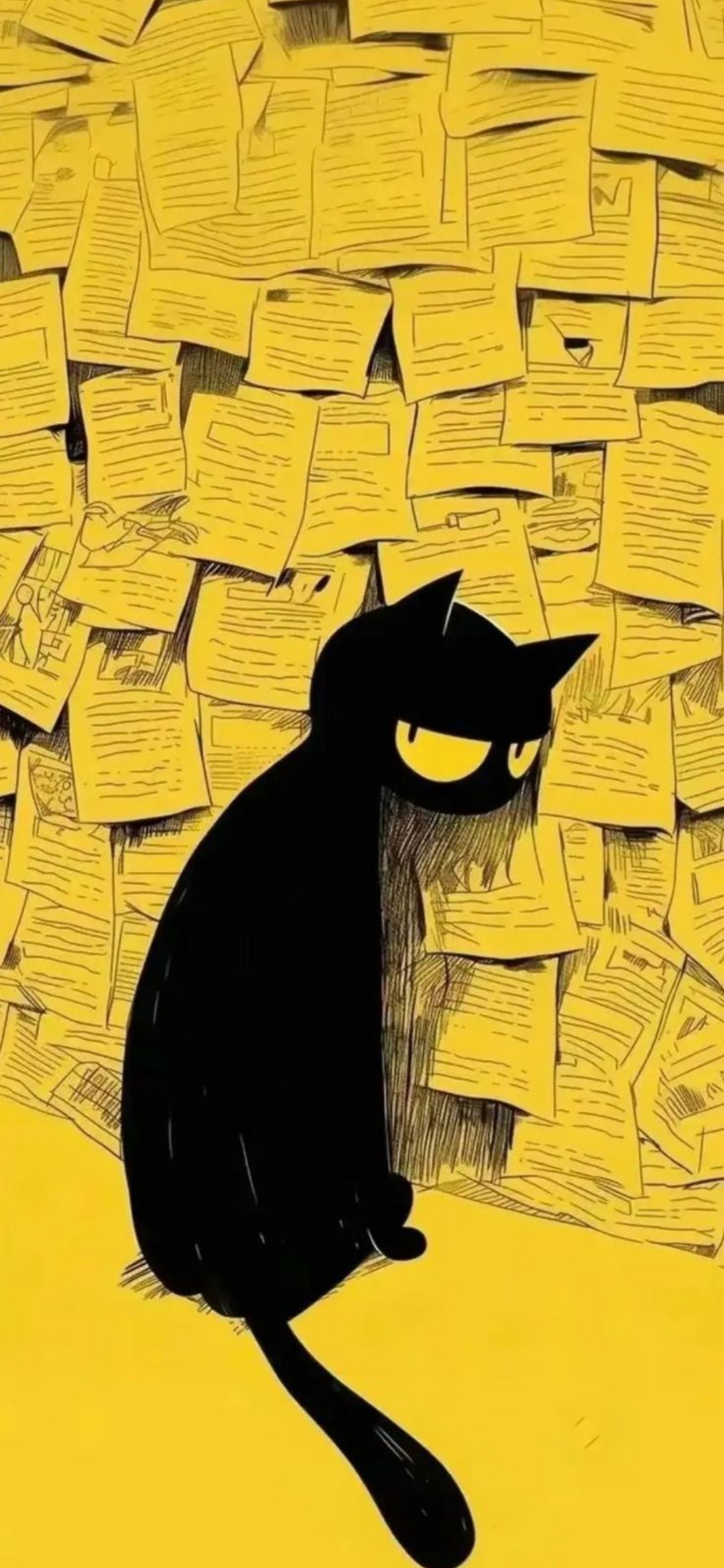 A mysterious black cat with striking yellow eyes sits against a wall covered in yellow papers. The artwork has a bold, graphic style, creating a sense of intrigue and focus on the feline subject.