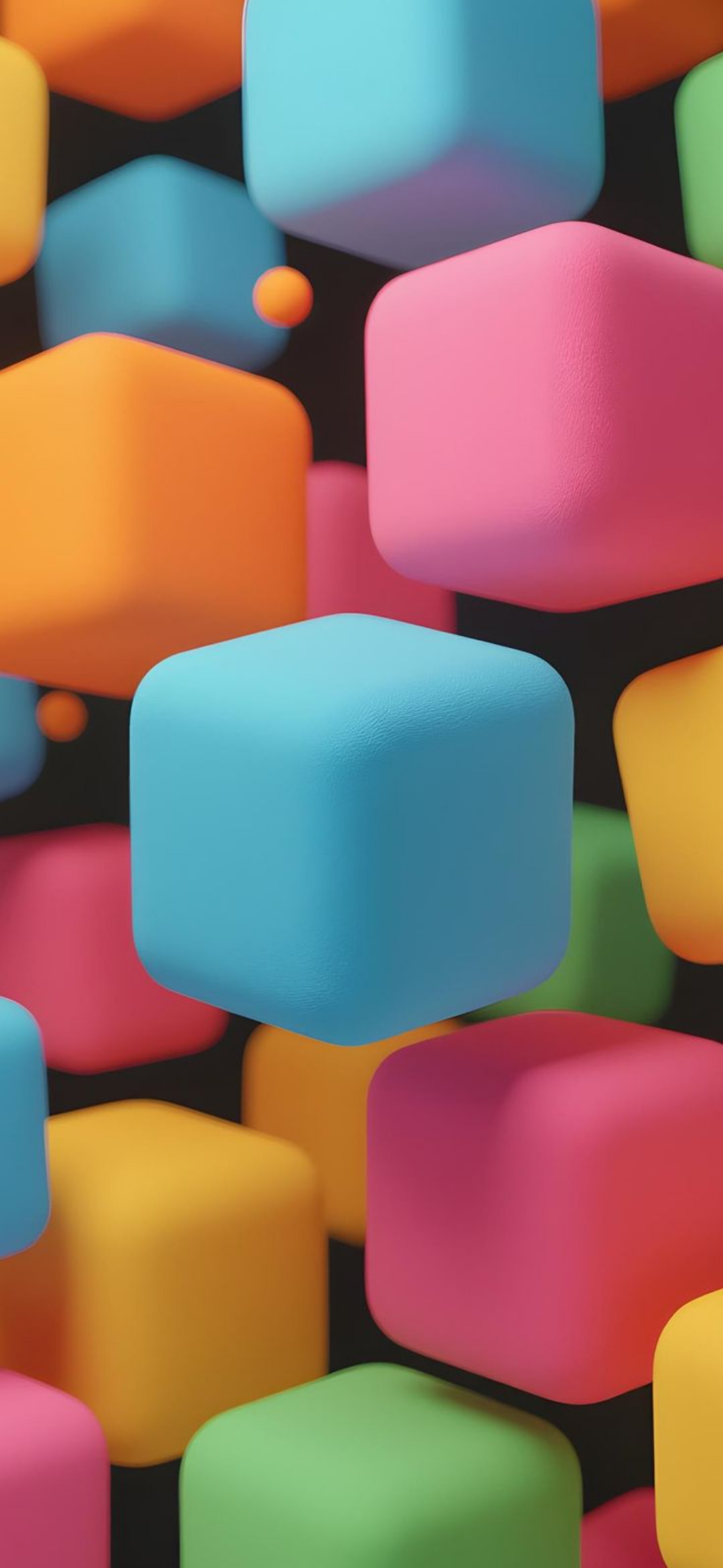 Dive into a world of vibrant, soft-edged cubes floating in a dark space. This abstract digital art features a playful mix of bright colors, creating a cheerful and modern aesthetic perfect for any screen.