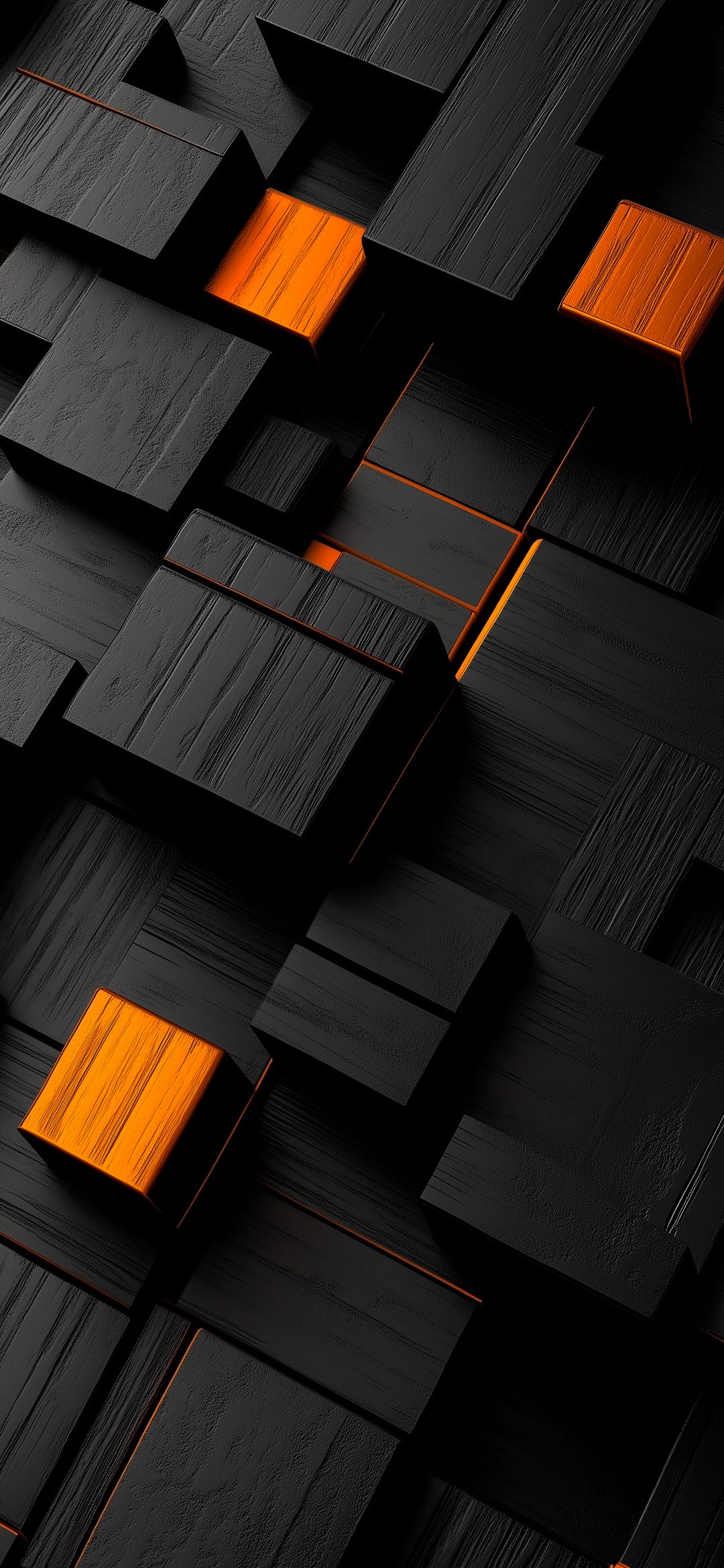 Explore a striking abstract design featuring a dark, textured surface with vibrant orange cubes. This geometric wallpaper creates a modern and dynamic visual experience, perfect for any digital space.