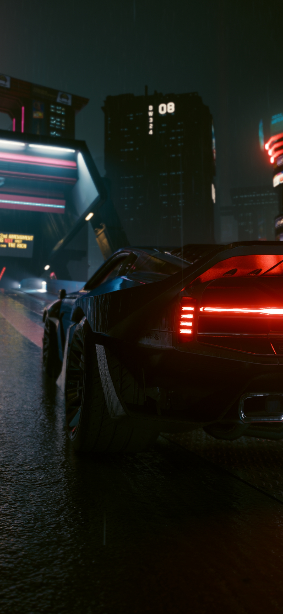 Experience the thrill of a rainy night drive through a neon-lit cyberpunk city. This wallpaper captures the sleek design of a futuristic car against a backdrop of towering skyscrapers and vibrant city lights.