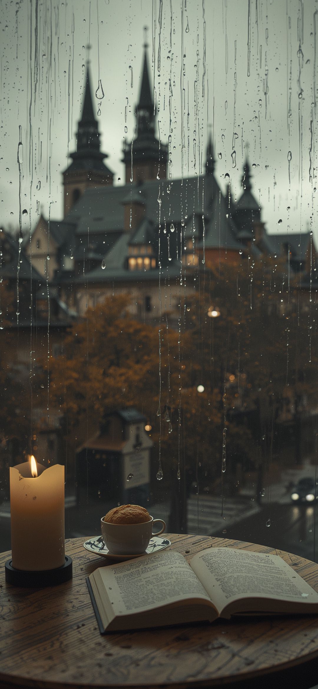 A warm candle glows beside a steaming cup of coffee and an open book, all viewed through a rain-streaked window. This cozy scene invites you to relax and escape into a good story on a gloomy day.