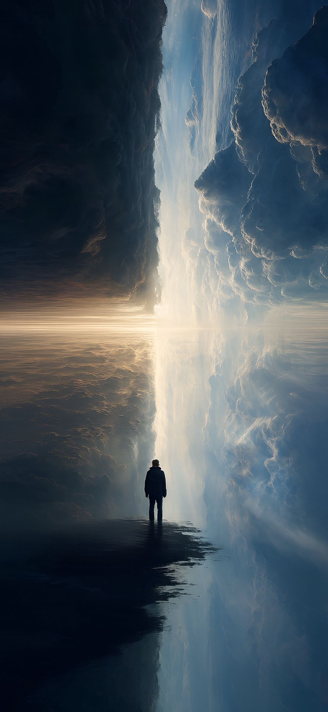 A lone figure stands at the edge of reality, facing a dramatic divide between dark, stormy clouds and bright, ethereal skies. This surreal landscape evokes a sense of wonder and contemplation.