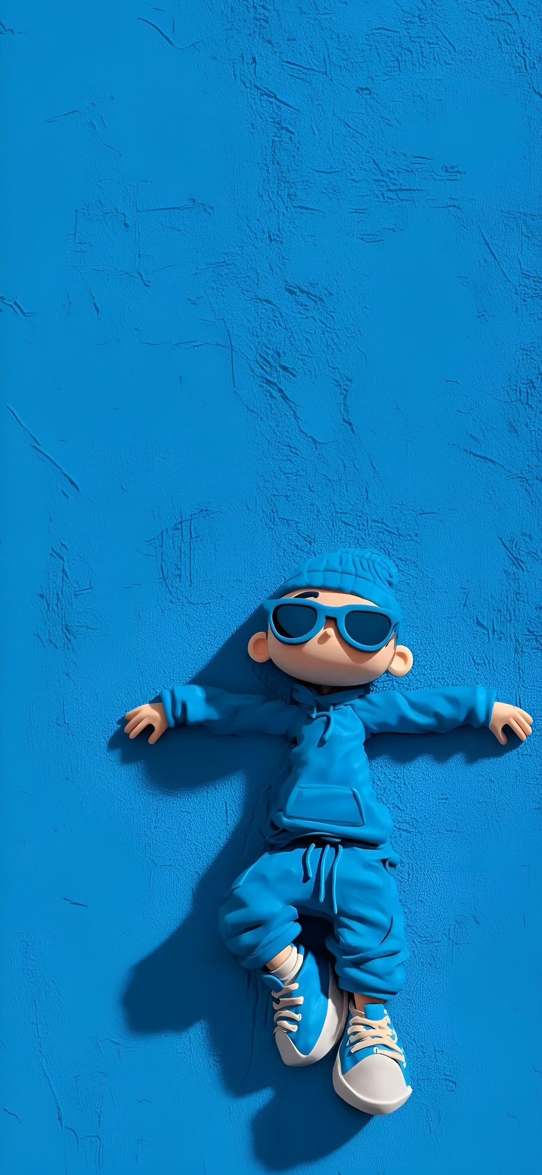 A cool 3D cartoon character dressed in blue, complete with sunglasses and a beanie, is lying on a textured blue background. This vibrant and playful wallpaper captures a relaxed, stylish mood.