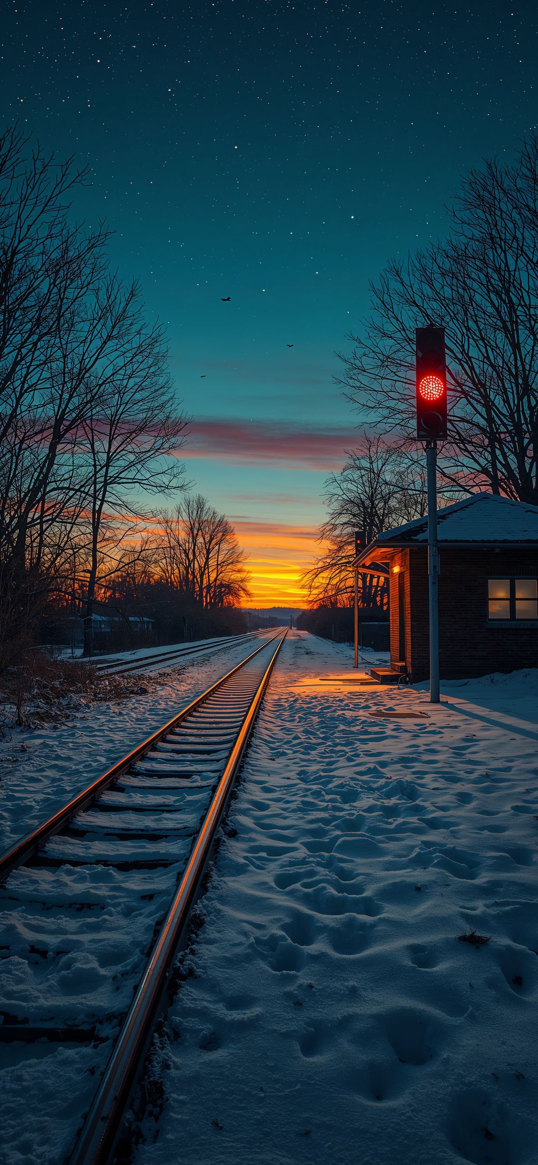 A serene winter sunset paints the sky with vibrant colors over snow-covered train tracks. A lone signal light glows red, creating a peaceful yet striking scene.