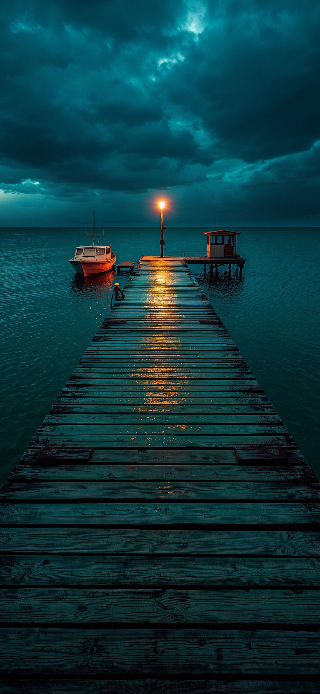 A solitary pier stretches into the dark, moody ocean under a stormy sky. A single lamp casts a warm glow on the wet wooden planks, reflecting a boat moored nearby. The scene evokes a sense of calm and mystery.