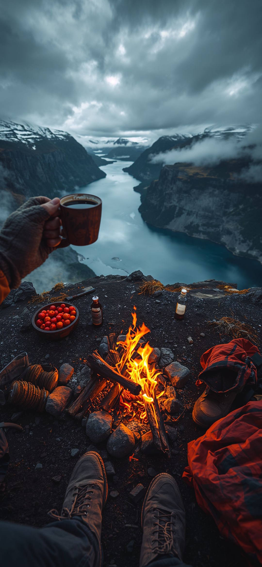 Experience the tranquility of a mountain campfire with a warm drink and stunning fjord views. Perfect for cozy, adventurous vibes.