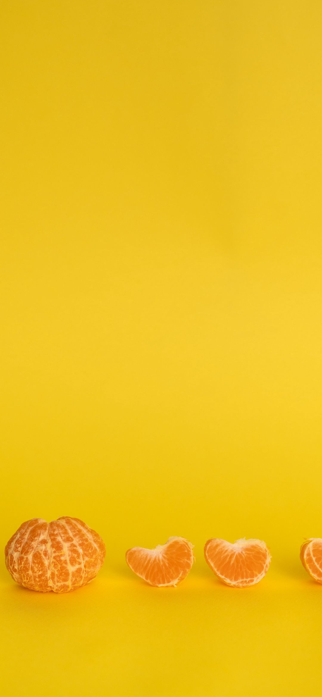 Bright and cheerful, this wallpaper features peeled tangerines and slices arranged on a vibrant yellow background. A refreshing splash of citrus color for your screen.