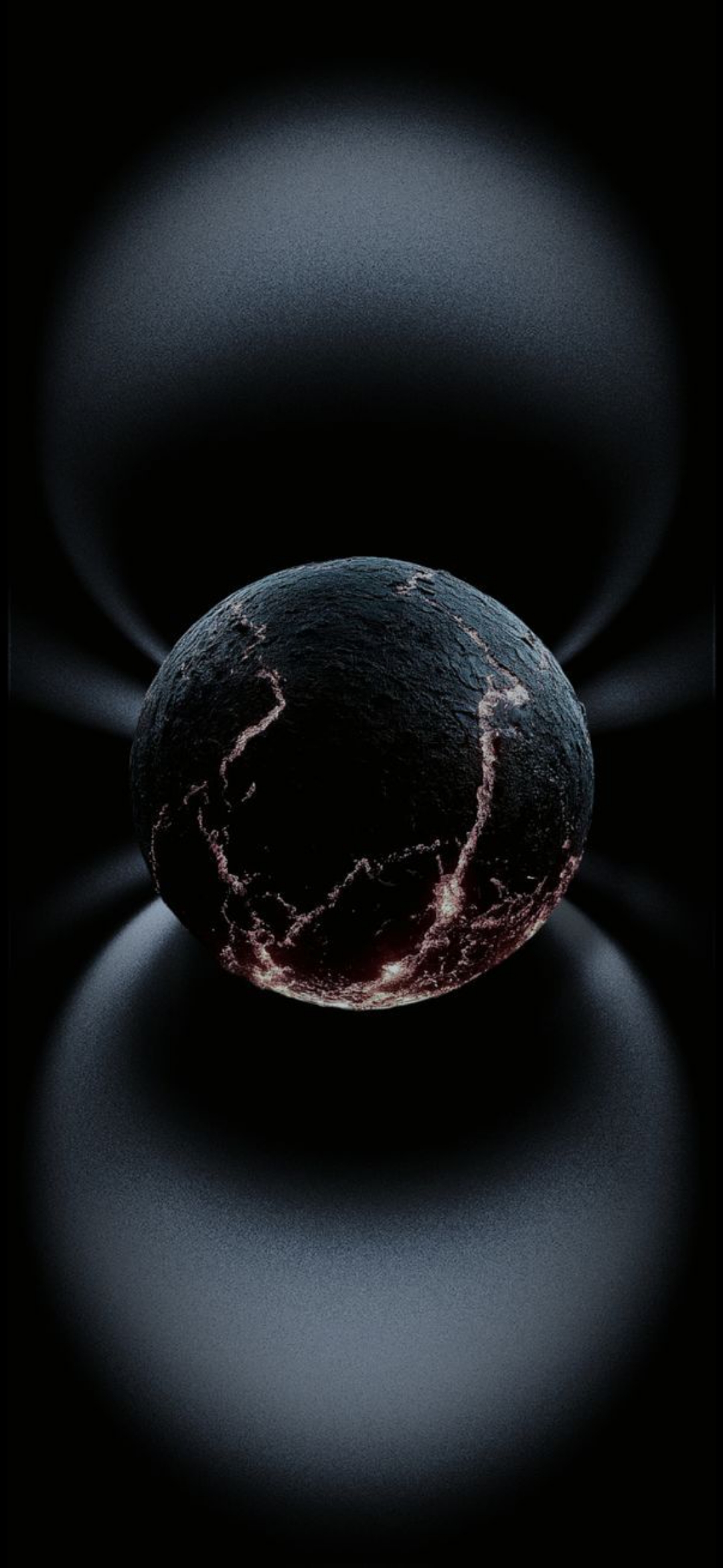 A dark, textured planet with glowing fissures dominates the scene. Eerie light emanates from within, creating a mysterious and dramatic atmosphere. Perfect for sci-fi and space enthusiasts.