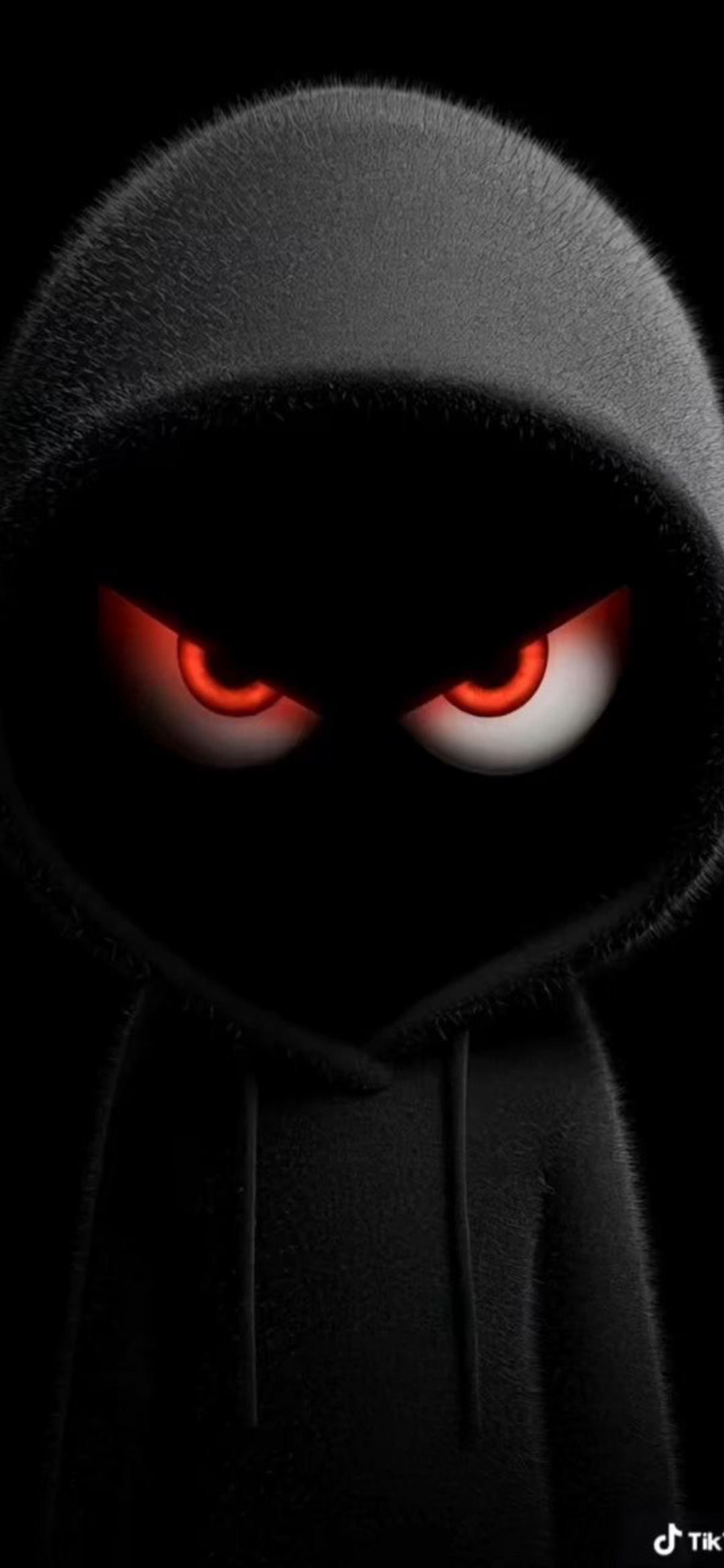 A mysterious character with a black hoodie and piercing red eyes stares out from the darkness. The image evokes a sense of intrigue and a hint of danger, perfect for a dark or cyberpunk theme.