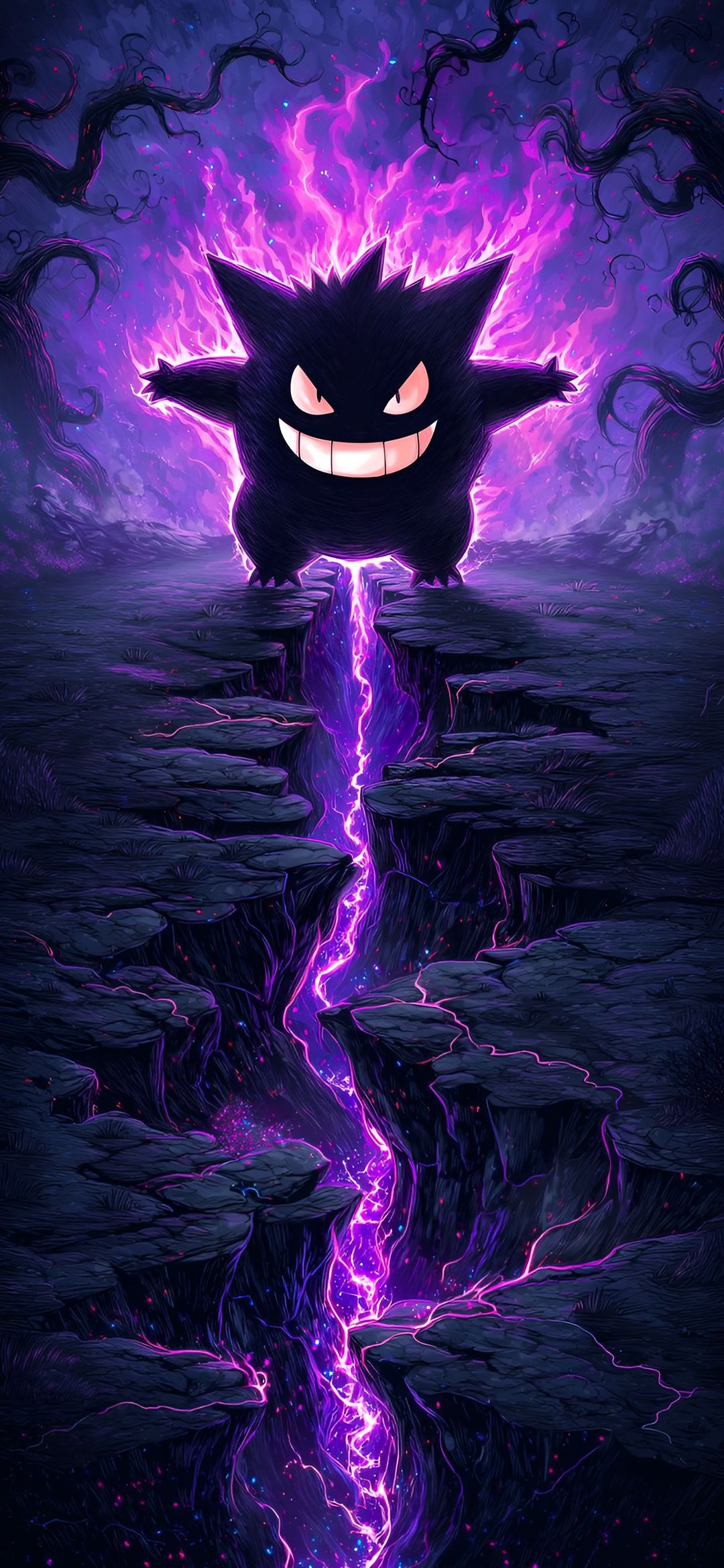 Experience the electrifying power of Gengar in this dark fantasy wallpaper. A crackling purple energy surges from a chasm, illuminating the shadowy landscape and the mischievous Pokémon.