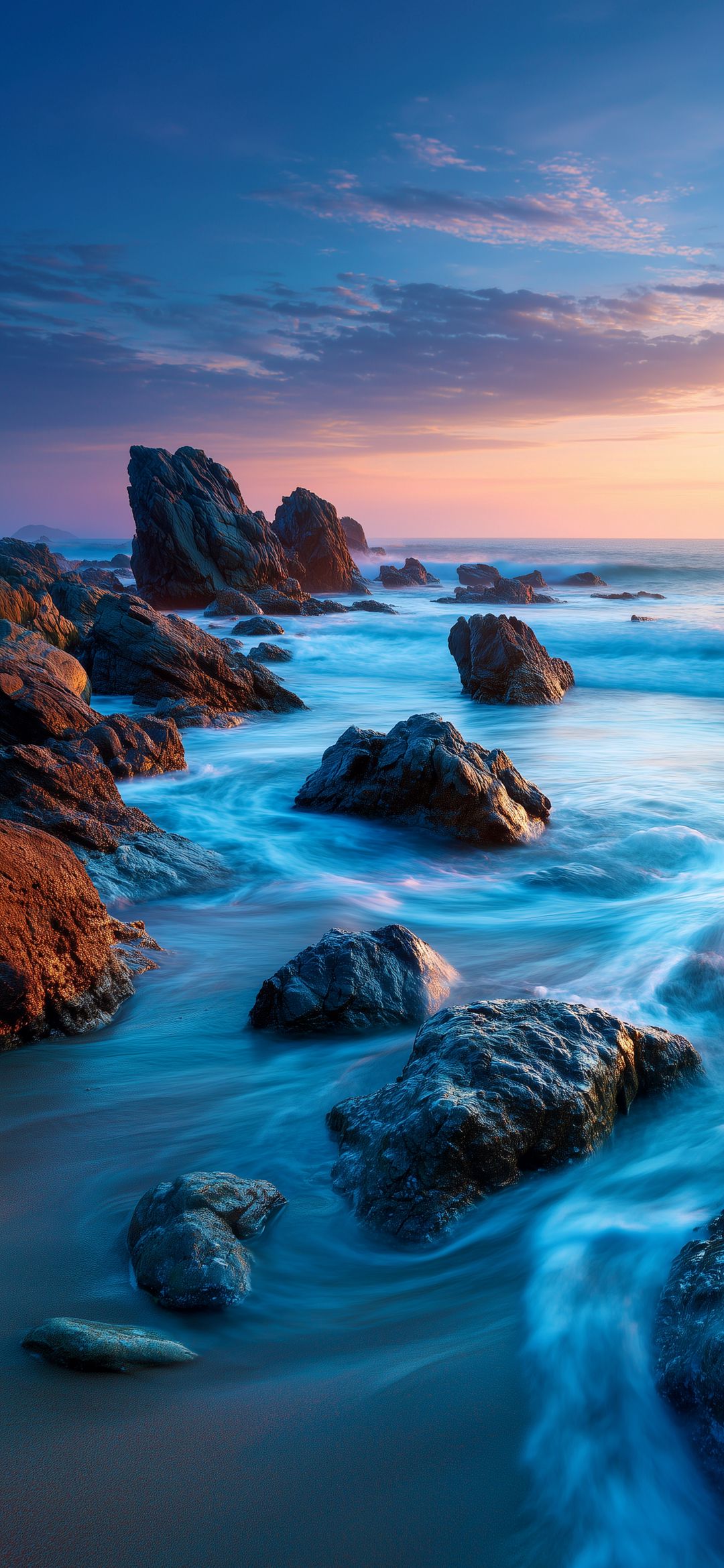 Experience the tranquil beauty of ocean rocks at sunset. The gentle waves create a mesmerizing blue flow around dark, rugged stones, under a soft, colorful sky. Perfect for a peaceful escape.